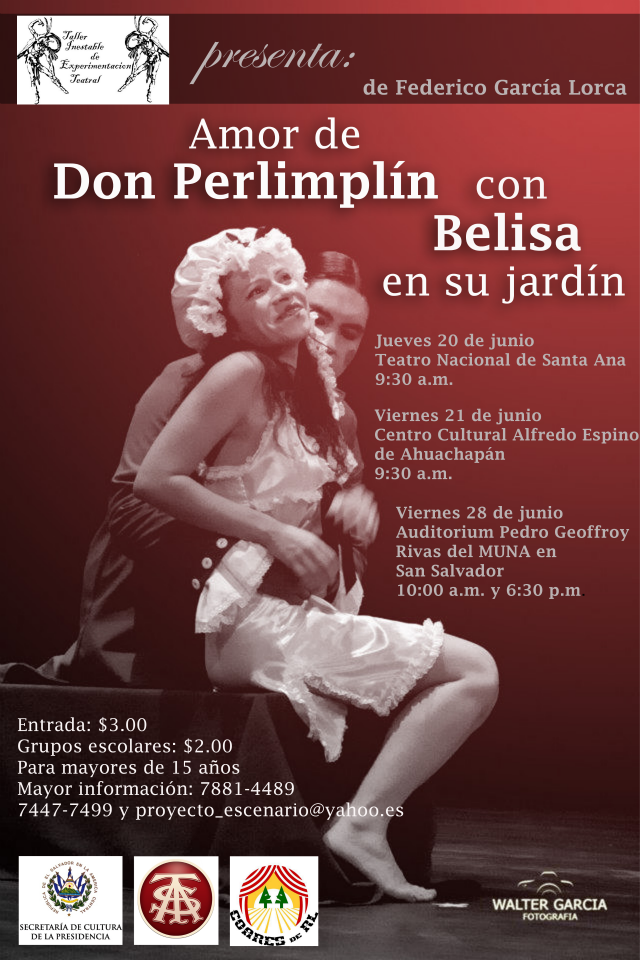 Luego vino el teatro y la mayoría de sus obras están en mi lista negra, llevo dos demonios exorcizados hasta el momento y espero que en el futuro sean más. De hecho este mes celebro el doble cumpleaños de Lorca y El TIET (el 5 de junio), este viernes 28 de junio, a las 6:30 p.m. celebraremos el octavo aniversario del TIET, presentando una obra que fue mi fijación durante algunos años hasta que pude llevarla a las tablas: "Amor de Don Perlimplín con Belisa en su jardín", disfruté mucho el montarla y los versos que Perlimplín recita al final del segundo cuadro, me parecen de los más bellos que he leído: